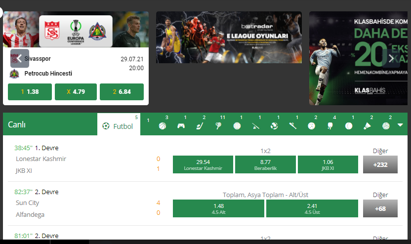 Bahis hesabınıza giriş yaptıktan sonrasında oynamış olduğunuz kuponlarınız ve paralarınızın değişmediğini görmüş olacaksınız. Klasbahis sitesine giriş yaptıktan sonrasında casino bölümünde de zaman geçirebilirsiniz. Casino oyunlarını oynamak için siteye para yatırdığınız vakit 1000 Türk Lirasına kadar bedava casino bonusu kazanabilirsiniz. şayet verilen bu bonusunun da çevrim şartlarını tamamlarsanız canlı bahis sitesinden çok yüksek oranda para çekme şansınız olabilir. Siteye üye olmak için yapmanız ihtiyaç duyulan tek şey aşağıda bulunan butonları kullanmanız.