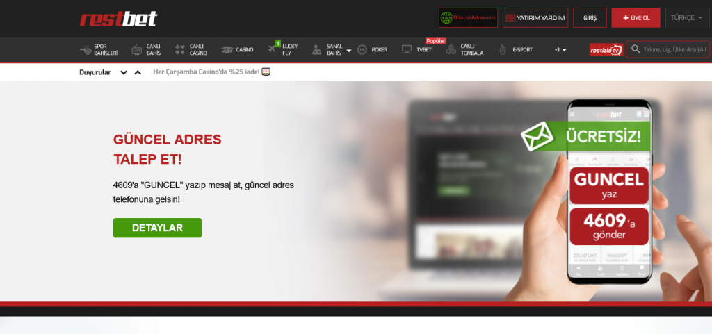 Bahis siteleri sayfaların kapatılması sonrasında ortak bir çözüm bularak uygulamaktadırlar. Bahis siteleri kapatılan adres sonarsında kullanıcılarına farklı bir giriş adresinde hizmet göstermektedir. Restbet giriş adresi içinde günümüzde aktif bir kullanım sağlamaktadır. etken olan adresin kapatılması hemen sonra ise tekrardan yeni bir site açılara hizmet kalınan yerden devam edilecektir.
